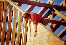 ![]() Jef up high nailing in plywall siding, Reese(in shadows) and John are below. They were responsible for installing beams and rafters over a period of about 2 days ![]() |