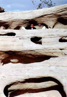 | On the 15th, hiked Peak 564 in Borrego Sink area, a 10 mile, 3 hour hike. Walked across the sink, thru mesquite forest, by a cool campsite in some tall tamarisks, by an abandoned homestead, and up Peak 564, which is just a large sandune supported by mesquite, starting and finishing at home. This hill overlooks the dump. On the 22nd, hiked up Hellhole Canyon beyond first fork, in search of 30' waterfall. Failed. Nice fall colours. Difficult hike. 5 hours. ![]() Flying saucer clouds were seen all day Saturday! On the 7th and 8th, participated in Borrego mixed doubles tournament, with partner Barbara Rathbun, we failed to make it. Got a free breakfast at La Casa from Hank and Linda. On the 24th, Jef, the klutz, took spill while hiking Cowles. Trail rash. ![]() Grapevine at Maidenhair Falls Shows fall colours. | |||||||