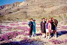 On the 8th and 9th, took Karyn up Cowles, taking 1 roll of film of flowers there on the 7th. Saw the Alaska film at Reuben H Fleet. Then went on 2 hikes. A quick one to Palm Wash on the 7th, and a medium one to Lookout Rock on the 8th. Took 5 rolls of pix. ![]() Karyn at Cowles - note the blue ceonothus flowers ![]() At the summit of Cowles Lookout Rock North side of Pinyon Ridge On the 13th, took tennis club to look at flower fields on Henderson Canyon Rd. Also did a loop over Texas dip, out to the Mine Wash morteros, and then to Tamarisk Grove where we hike the Cactus Loop Trail. ![]() Karyn took a few pix of flowers ![]() ![]() ![]() On the weekend of the 14th, March tennis tournament was rain-shortened. Hank came down. Also Karyn and I entertained Eric and his girlfriend on Sunday. |