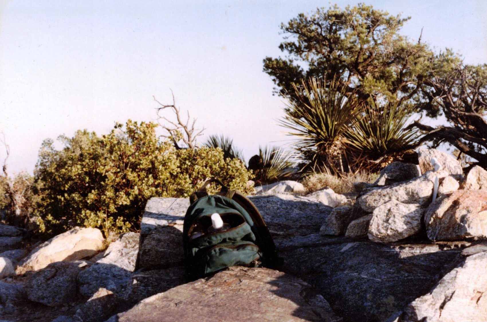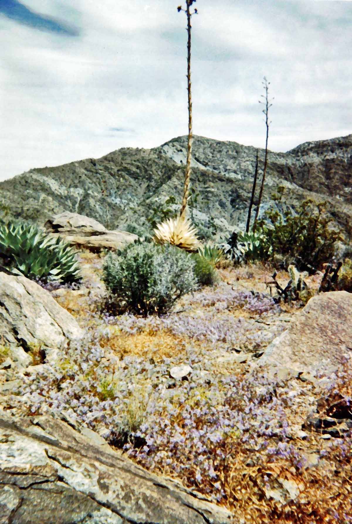 The knife edge part of the hike Weird agave stem looking down on pass to Mile High Peak High enuff to finally see the Salton Sea to the east Thistle blooms The register at Villager Peak My backpack at the peak. No more pix on the way down, as I was going to be in severe distress the last half of the descent | |||||