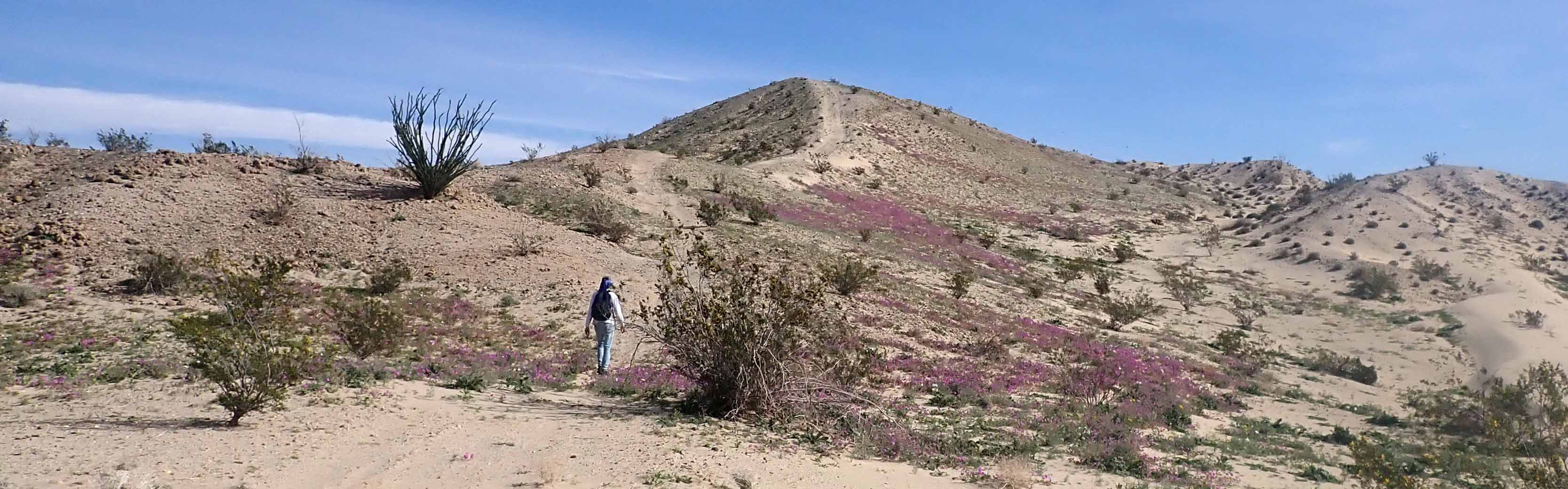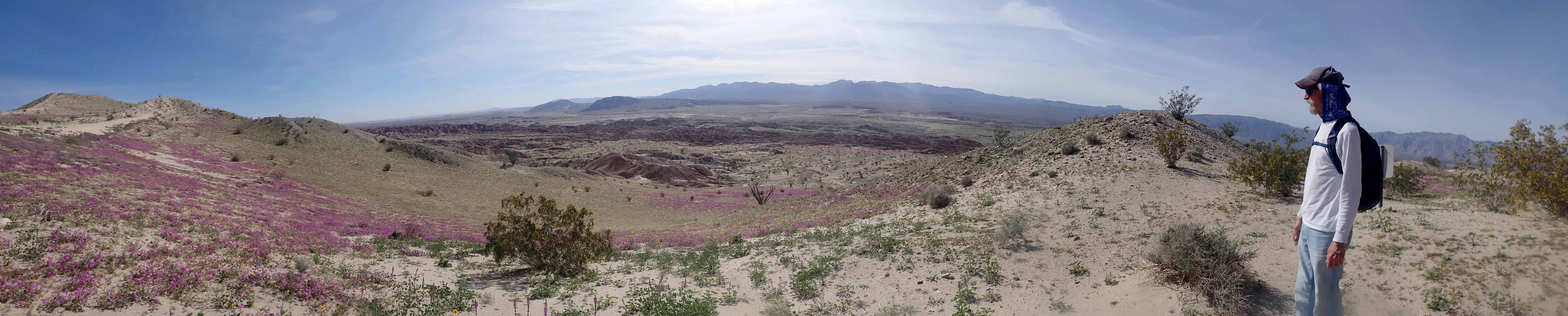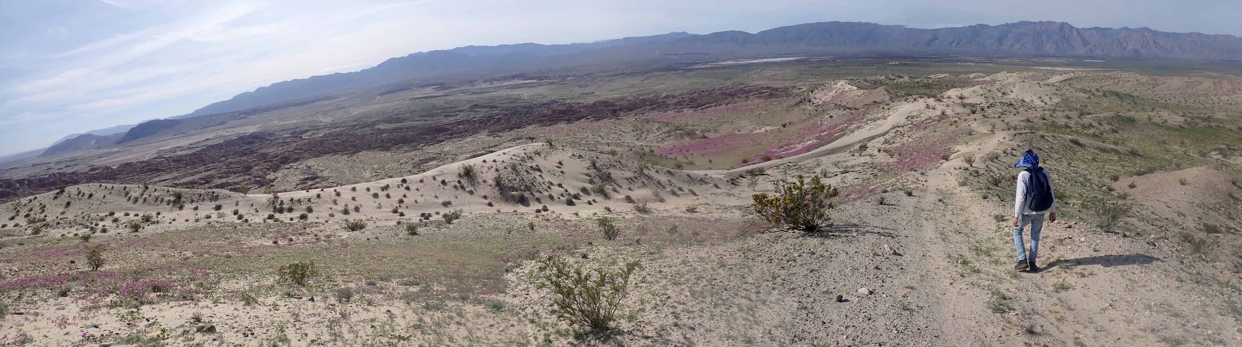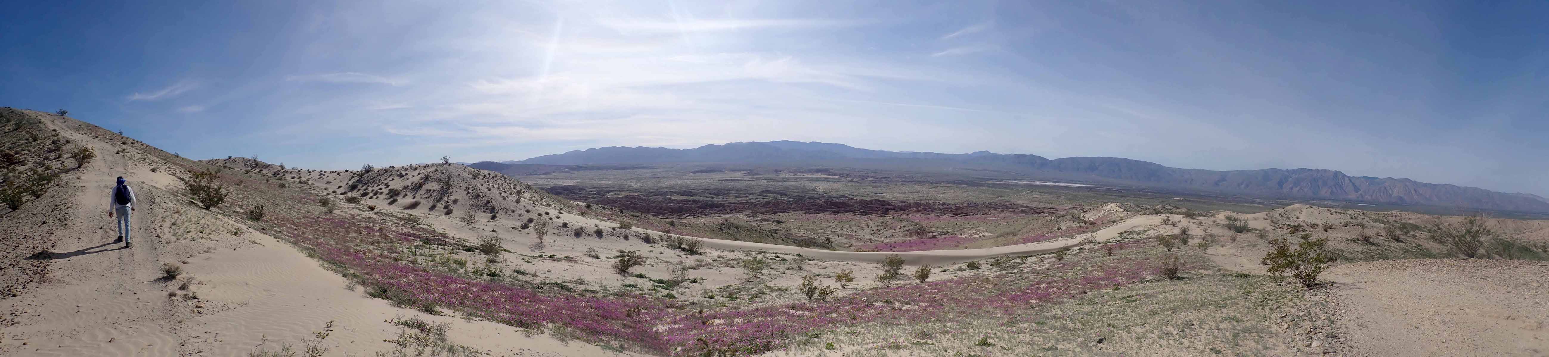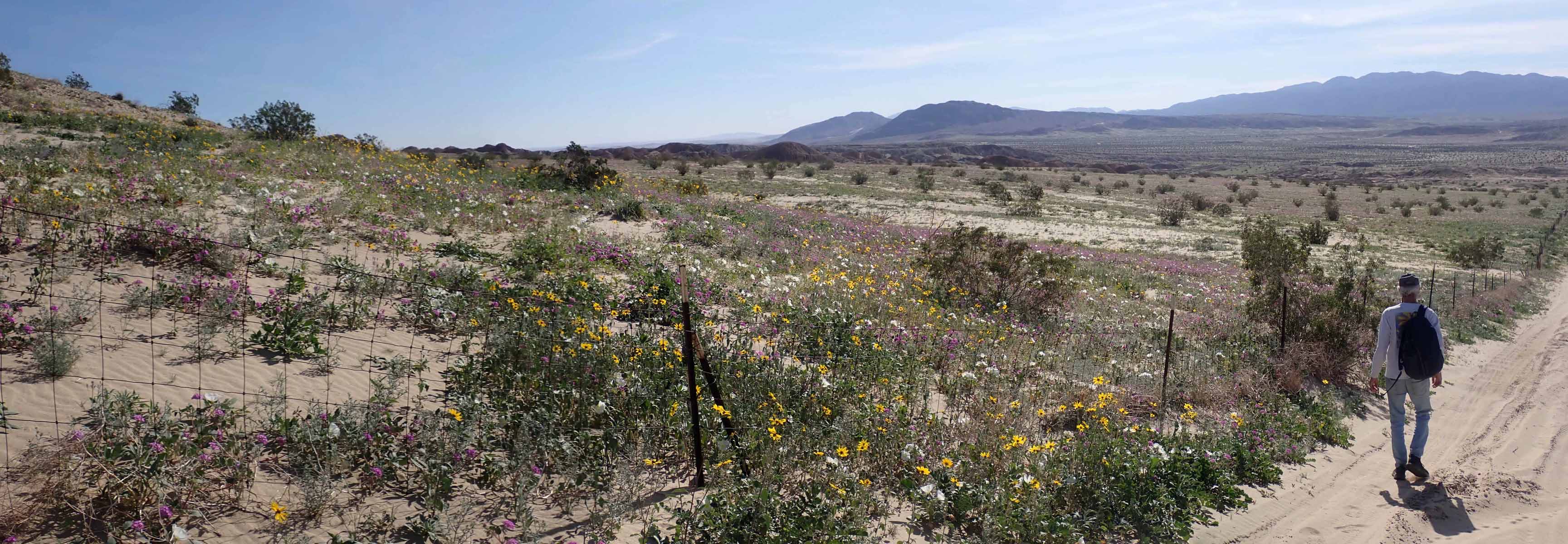 ![]() We dined on Canneloni this evening On the 25th, Kathy took it easy at home while Flaco & Jef hiked Ant Hill. Later that day, after Flaco left, Kathy & Jef walked the puppies on a new pole-line road for over 3 miles. Jef walked about 10 miles this day. ![]() Briefly stopped at Henderson Canyon flower fields before the hike ![]() ![]() Flaco at left in this panorama ![]() Flaco starting the hike ![]() Saw these 2 parasailors a few times on our hike ![]() One of, perhaps, 100 desert lily plants we saw on this hike ![]() Parasailors in front of Fonts Point(L) and Ant Hill(R) ![]() Actually saw these other hikers! ![]() Baby ant hills on way to Ant Hill ![]() Patch of 8 desert lilies ![]() We were about to walk on this dirt road when the 2 parasailors, following the road, passed right by us! ![]() ![]() ![]() ![]() Desert sunflower ![]() Dune primrose ![]() Lots of Sahara mustard as we near the hilly part of the hike ![]() ![]() ![]() Toro Peak ![]() Hit this fence line, but followed it a bit before crossing it at a low point, such as this ![]() Flaco getting something from pack ![]() ![]() When Flaco was about to put on more suntan lotion, I offered my bandana to protect his neck ![]() Flaco sporting his new headgear ![]() ![]() Desert lily bloom amid verbena field ![]() Flaco noticed this chuckwalla when it moved ![]() Another big patch of desert lily ![]() Creosote blooms with verbena field in background ![]() After reaching the ridge leading up to the peak ![]() Panorama with Ant Hill at left and flower field on south slope of ridge ![]() Upper reaches of this flower field are brown-eyed primrose ![]() ![]() Flaco approaching the peak ![]() ![]() ![]() Flaco at the peak. Jef called Julie & Kathy, but noone answered ![]() Badlands panorama from the peak ![]() Heading back down ![]() Heading into the Valley of Flowers ![]() ![]() ![]() ![]() ![]() Montezuma Grade & Borrego in distance. Green in middle ground might be mostly Sahara mustard ![]() Sahara mustard ![]() ![]() ![]() Summary of Ant Hill hike - about 6.5 miles ![]() Summary of hike with doggies - about 3.2 miles On the 26th, took it easy doing chores at home. On the 27th, Kathy returned to work. Jef walked to Tito's to pick up black Jeep, taking a new route. ![]() Meter still heading north ![]() After continuing x-country from Walking H, saw this abandonned wellhead ![]() Terrain to be traversed ![]() Chinchweed that bloomed so spectacularly in this area in October is all dead now ![]() Crossed this drainage choked with vegetation ![]() This might be the new invasive Valeria weed - this one about 5' tall ![]() Old pumphouse along DiGiorgio Rd ![]() Slab of an abandonned house ![]() Wellhead implies this was a pumphouse ![]() The drainage I crossed over emptied on east side of DiGiorgio Rd in a 6' deep trench - dammed up before enterring an even bigger 12' deep drainage - perhaps to have more water seep in here, not far from that pump house ![]() Where the main drainage comes from DiGiorgio - I believe this is when Palm Canyon creeks makes it this far ![]() Looking down the drainage channel - I believe this was made to prevent flooding at the Borrego Springs Resort ![]() Panorama of this channel ![]() Found this kite, which I later found out to be part of a $700 kite Steve had lost a year ago ![]() Turned out to be Steve's number ![]() Use your imagination.... No Trespassing, perhaps? ![]() Kathy had me look at the sunset this evening - just caught the tail end of it ![]() ![]() ![]() ![]() On the 28th, drove Kathy to MD in Rancho Mirage. We went on an hour hike from city hall afterwards, before shopping and driving home. ![]() Sunrise this morning ![]() Starting hike above the city hall ![]() City hall is composed of buildings to the left ![]() Sitting at the first lookout ![]() Next leg of hike took us to a water tank where we turned and came back ![]() Back at the lookout ![]() Words of wisdom ![]() Our viewing bench ![]() Flowers at Henderson Canyon as the sunset continues to fade ![]() ![]() ![]() ![]() On the 29th, another work day for Kathy. Jef did some weeding at Sewanee. ![]() Sunrise this morning ![]() On the 30th, did chores at home all day. On the 31st, packed up and drove to Niland to get wind chimes Kathy couldn't get weekend before and camped at Bashford's Hot Springs Resort. ![]() At Bashfords - we set up tent before heading to Bombay Beach ![]() We parked at "Last car that parked here is still missing" space, as Steve was packing up - managed to buy the wind chimes ![]() Steve bagging chimes for Kathy ![]() ![]() Tesseract projection ![]() Setting sun ![]() ![]() ![]() Roon rising about porta-potties ![]() Sun setting at left in this panorama with moon rising at right ![]() ![]() We spent an hour or so listening to a great band playing at the "trash dance" this evening at Bashford's rec room | |||||||||||||||||||||