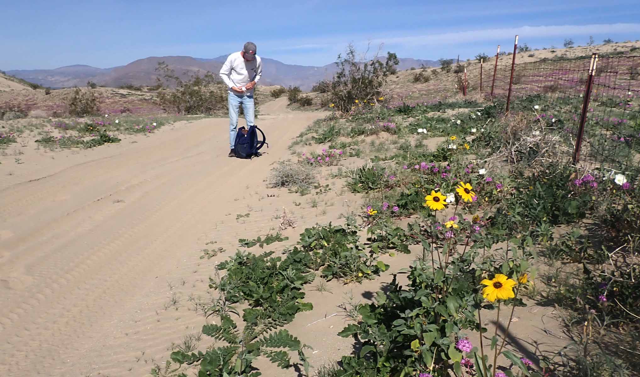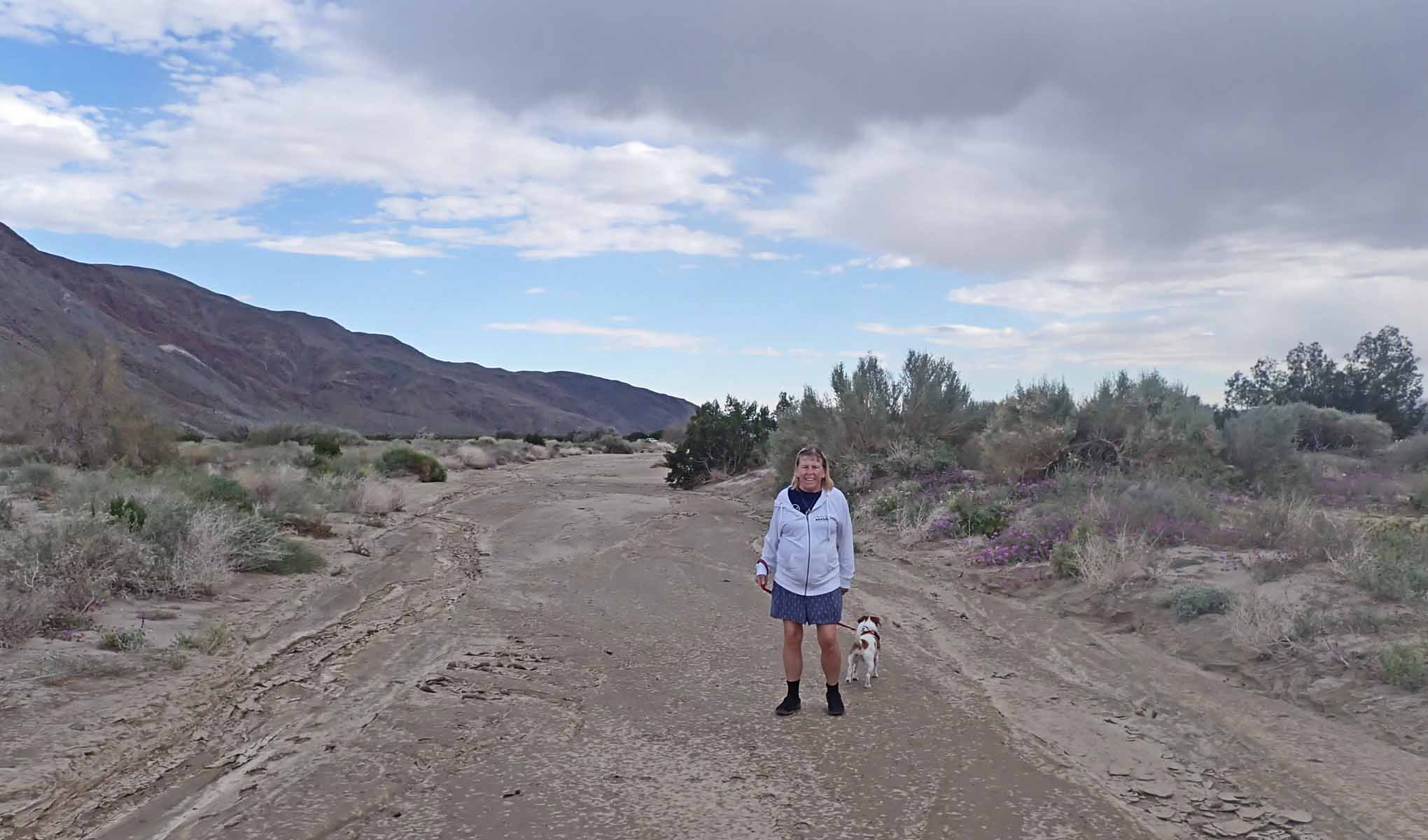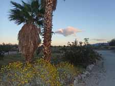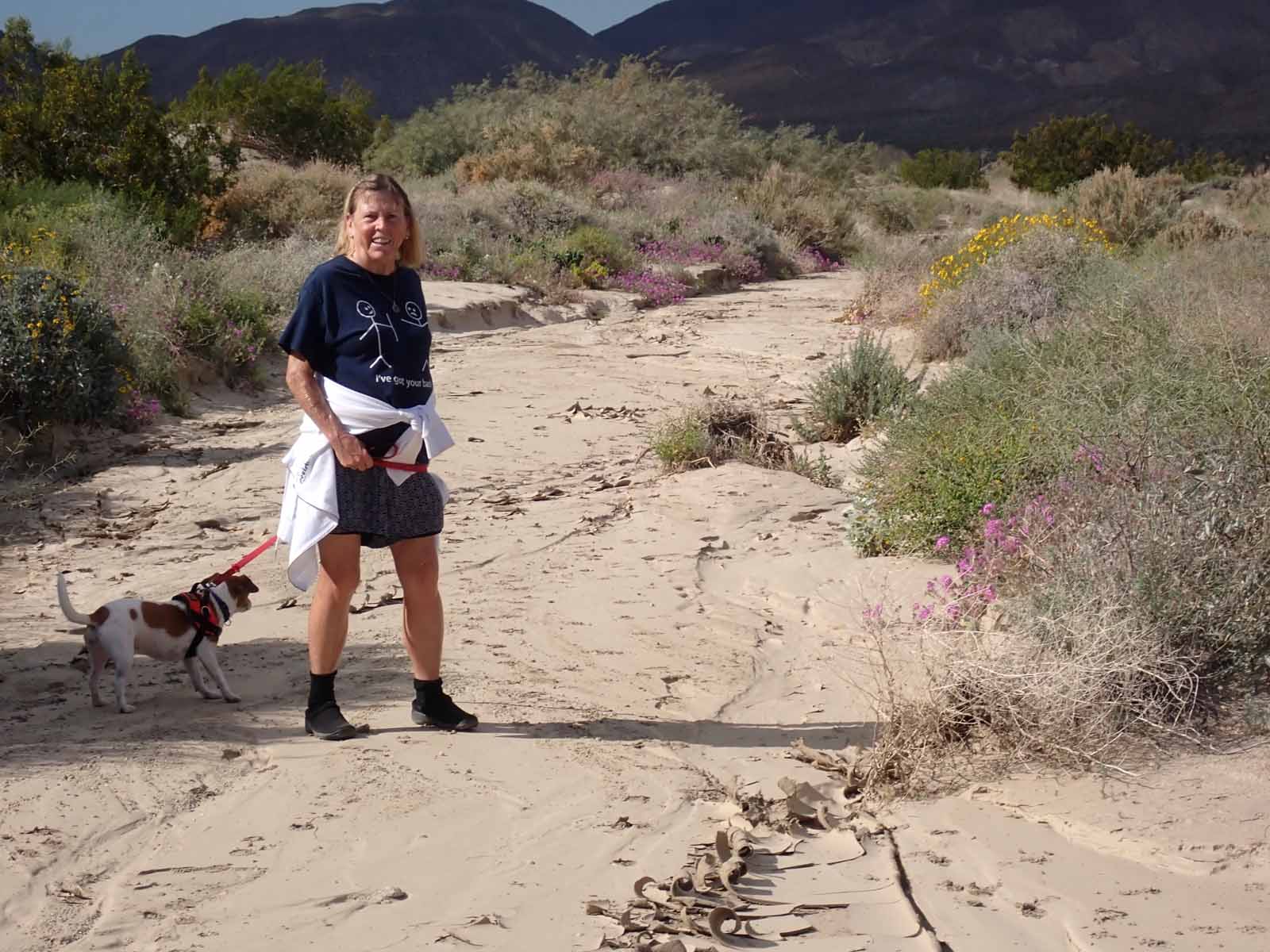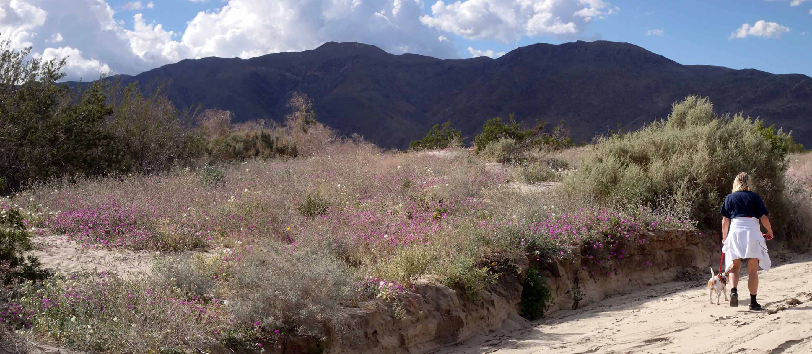 ![]() Downtown Borrego ![]() Desert dandelion & brown=eyed primrose ![]() Cool clouds to east - this is intersection of BS Rd & Tilting T On the 12th, a very full day at the office for Kathy. Jef did some work at Sewanee house. ![]() Weeded & located an irrigation leak ![]() Kathy called to let me know of a rapidly fading sunset ![]() On the 13th, we took doggies for a walk in Coyote Canyon - 1h 15m, about 2.5 miles. ![]() Our front yard on this partly cloudy day ![]() Starting our hike in Coyote Canyon ![]() Flowers were somewhat muted along the wash ![]() Some flowers managed to survive in the wash ![]() Pepper by a Jimson weed flower the size of her head ![]() Bird tracks in wash ![]() Lupine, cheesebush & brittlebush all blooming ![]() Weather behind Kathy actually dumped a fair amount at our house this afternoon - even had some hale! ![]() Weather ![]() ![]() Interesting crack patterns in the wash ![]() It actually started raining on us! ![]() Pepper puppy with rain spots in wash ![]() Desert dandelion & lupine blooms in the wash ![]() Broomrape parasite! ![]() Popcorn flowers ![]() Bank is taller than Pepper! ![]() Ground nearly all wet at this point ![]() Kathy wanted a pic of her all wet - she is slightly damp ![]() Desert sunflower, verbena & dune primrose ![]() Nearing Jeep, which I parked in the middle of the wash - fortuneately no flash flood ![]() View from Jeep after our post-hike "Miller time". Think the rain didn't fall on the Jeep on our hike ![]() Saw this cool flower-lined dirt road off of DiGiorgio - looked cooler before it got rained on ![]() ![]() On the 14th, drove Kathy to MD in Escondido & shopped on the way home. ![]() Craters in front yard indicate possible hail prior day ![]() At Big Rock house after meeting with Holley & Alvaro ![]() Kym forgot to tell me about SpaceX launch until 20 minutes afterward, but managed this pic at that time On the 15th, walked over & took a few pix in our neighborhood. Then did some weeding & irrigation repairs at Sewanee house and did Broken Arrow to Wagon loop - about 3 miles - with Kathy & puppies. Then dined at the Krazy Koyote with Pam & Jaime. ![]() Sunrise this morning ![]() ![]() ![]() ![]() ![]() ![]() ![]() ![]() Wispy clouds today partially obstructed the sun ![]() Across the street, looking back to our house ![]() ![]() ![]() Headed to sand dune at the end of Box S ![]() A few verbena in our area ![]() Started on this animal trail onto sand dune ![]() Looking S to Glorietta ![]() ![]() ![]() ![]() ![]() ![]() ![]() ![]() Looking along ridge of old sand dune ![]() A few purple mat blooms ![]() ![]() ![]() ![]() ![]() A few desert chickory ![]() ![]() Fremont pincushions ![]() ![]() ![]() ![]() ![]() ![]() Tried fixing a couple of broken irrigation lines at Sewanee ![]() This bush at our next door neighbor looks like it might be native to CA ![]() ![]() Really tall ocotillo on Broken Arrow ![]() This house has some unusual things in their front yard ![]() ![]() Dancing saguaro statue by a peyote statue ![]() Celebrating Jaime & Pam's 60th anniversary at the Krazy Koyote ![]() ![]() Eating dinner ![]() Jaime had dessert ![]() Leaving the restaurant |