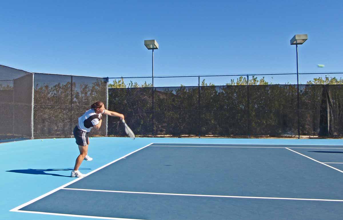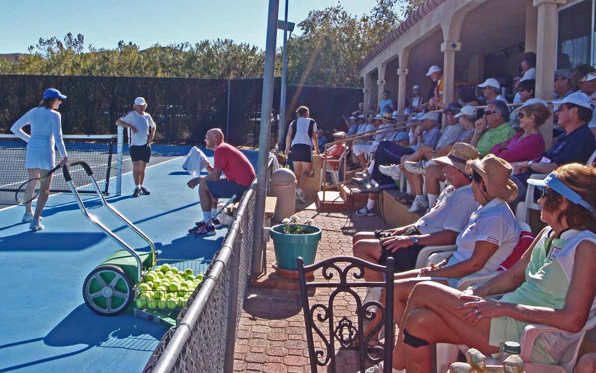 Anza Borrego Tennis Center with Murphy Jensen, Gretchen Magers, Lee Whitwell, Jaroslav Medik In between the morning and afternoon tennis clinics on this day, the tennis pros gave a demonstration of their abilities by playing a "Bobby Riggs vs. Billy Jean King" reenactment was the 1st set, where the girls, Lee and Gretchen, defeated Murphy and Jaroslav. Everyone played great, altho Murph's antics may have hurt the men's chances. For the 2nd set, a mixed doubles match was played. Murph and Lee came from behind to defeat Gretchen and Jaroslav 6-4. Before this match, Murph took requests from the audience, and a "tweener" was suggested. Well into the last set, Murph did have to chase down a ball hit behind him, and sure enough hit a between-the-legs return back to the other team. However, several points later, the other team did win that point. The crowd was not only entertained by Murph's antics, but at the high level of play. Jaroslav, Borrego's best player did fairly well in these exhibition matches, despite being 15 years older than the next older player. | ||