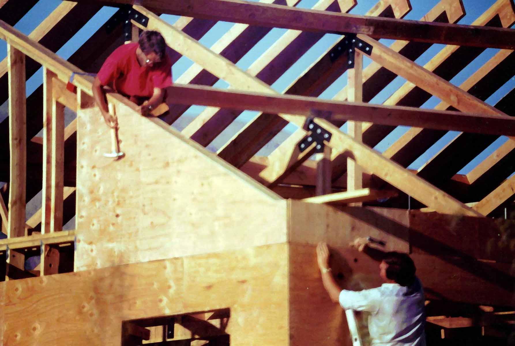 ![]() Jef up high nailing in plywall siding, Reese(in shadows) and John are below. They were responsible for installing beams and rafters over a period of about 2 days ![]() |