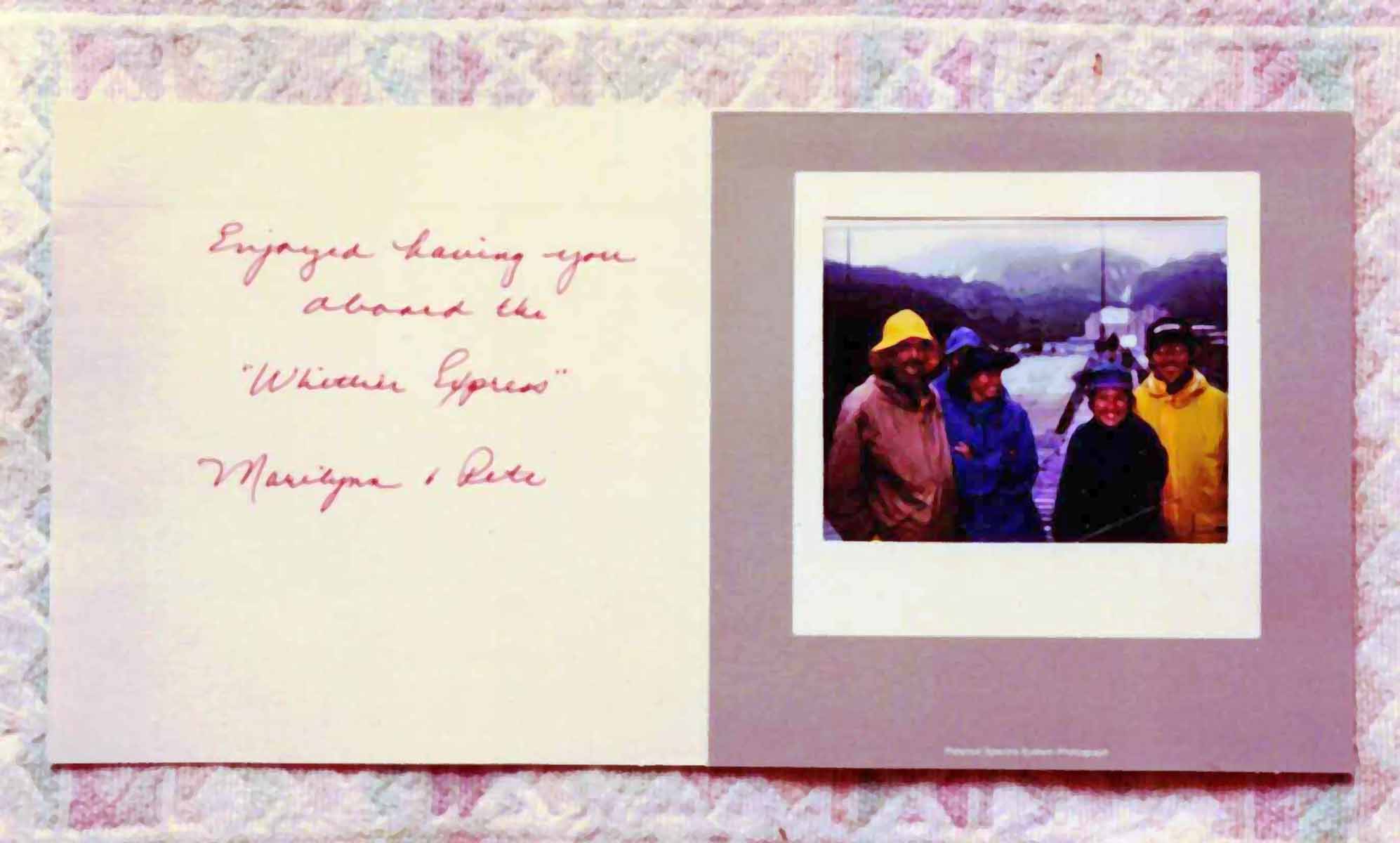 ![]() ![]() ![]() After arriving back in Whittier, the owners of the boat that dropped us off gave us these cards. Jef is behind Mari in this photo ![]() Jef in foreground After our kayak adventure, we did a nice day hike in the Chugach with the doggies. ![]() ![]() | |||||