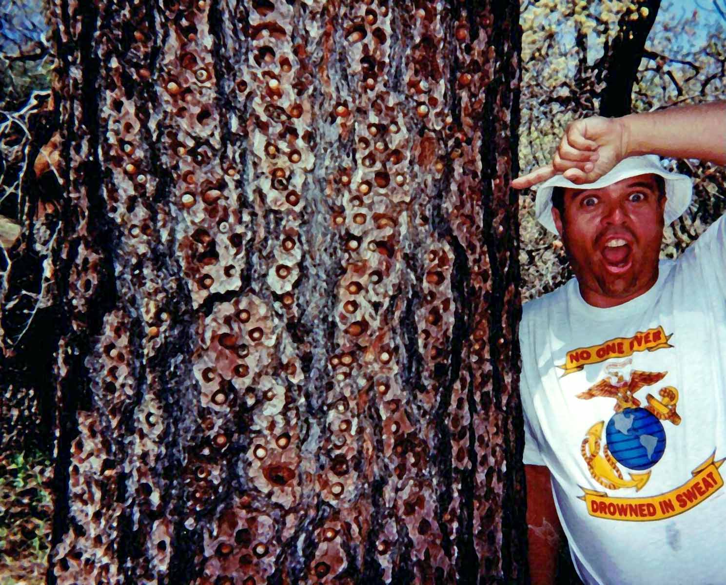 ![]() ![]() Near start of Cuyamaca's West Mesa trail was this pine where a squirrel had deposited acorns in woodpecker holes ![]() Dyer atop a giant live oak On the 31st, hiked Villager with Mari: 16 miles, 5000' vertical, 9 hours. ![]() ![]() Jef on E side of Villager | |||||