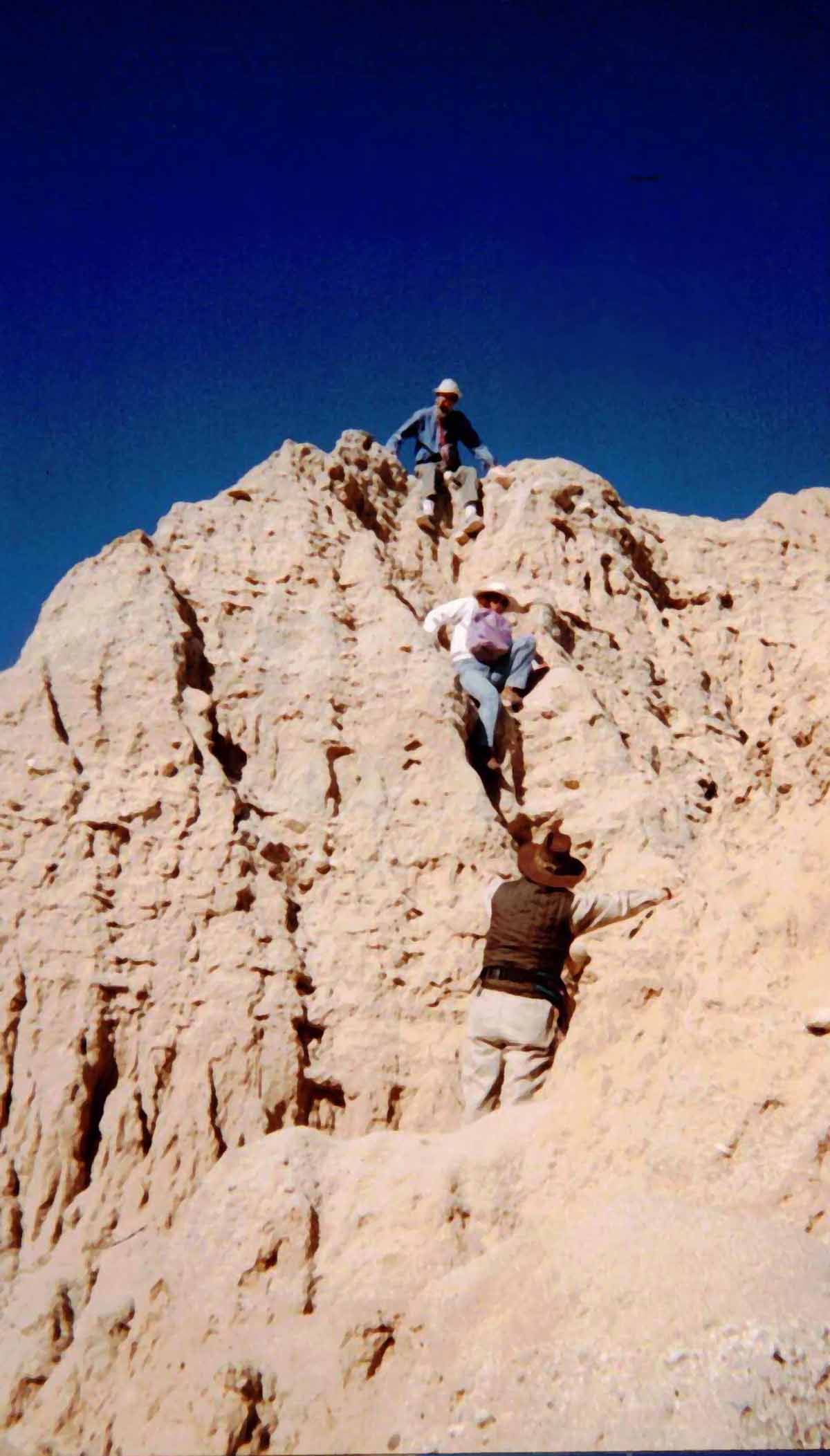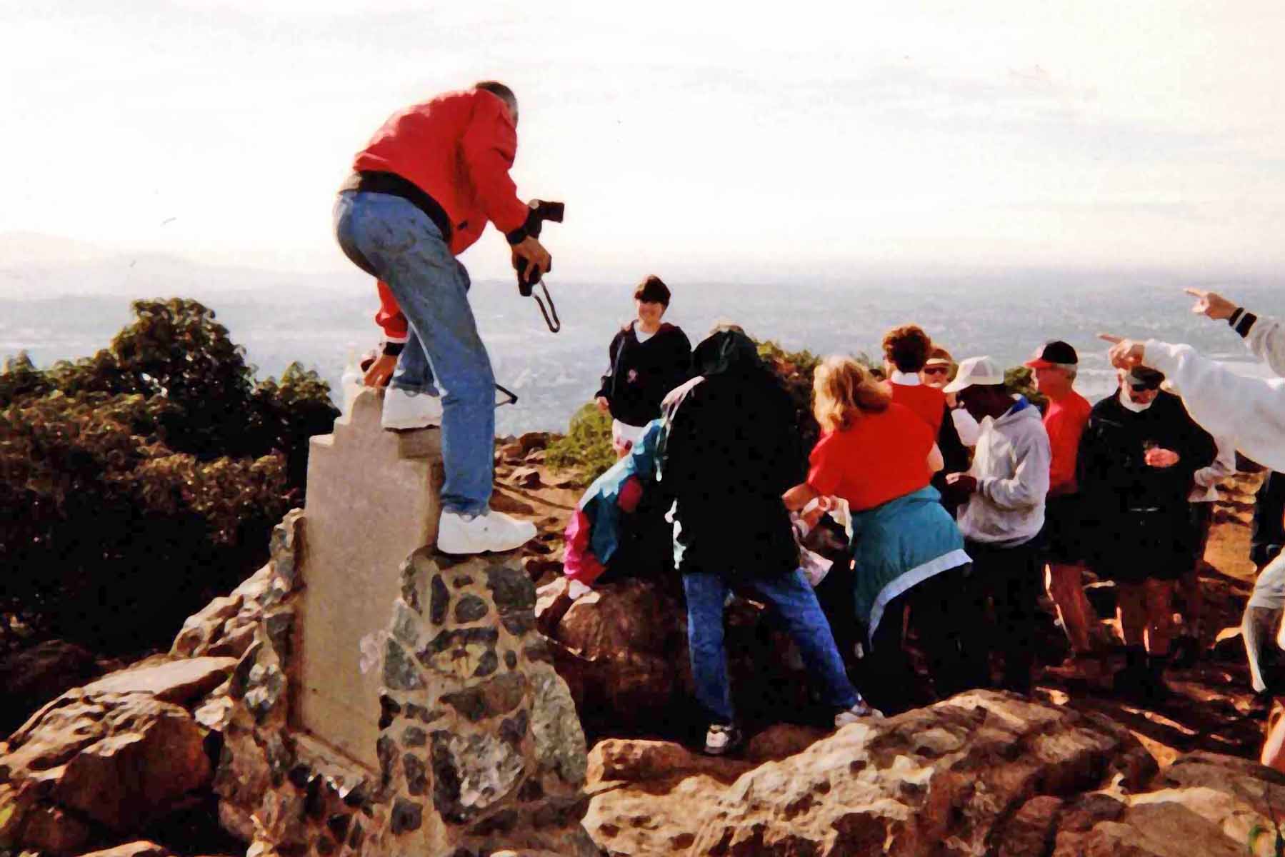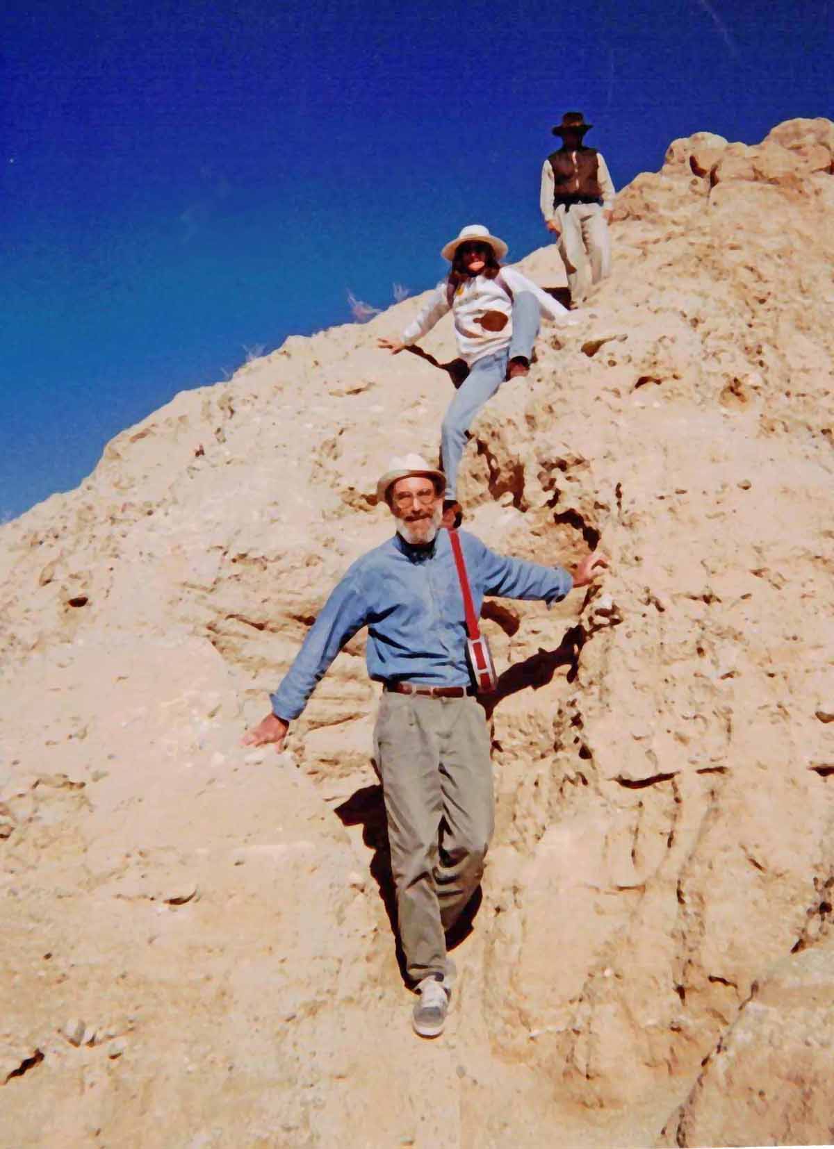 Met Lou while hiking Cowles on December 10. He had just got back from hiking to top of Kilamanjaro. I snapped his picture (see link). Lou bounced back from stomach cancer, from which he almost died 18 months ago. Quite an inspiration! ![]() Nearing summit ![]() At the summit ![]() Buzzer resting on the way back down On December 18, I took Buzzer to the X-mas party on summit, where I met Terry, Jim, Lou, and got a newsletter, and got 2 lottery tickets which won $12. ![]() Xmas potluck at the summit ![]() Terry On the 21st, hiked up Lizard Peak with Karyn on a cold damp day, and placed a register at the top. Vegetation was verdant. On the 23rd, hiked with Grace, Jim and Allen from Font's Point to the Slot, with signs of spring all the way (brown-eyed poppies, borrego asters, sand verbena were all blooming). ![]() Surveying our route from Fonts - we are heading to hills to the right(Borrego Mtn) ![]() ![]() Jef is partway down, checking out the route |