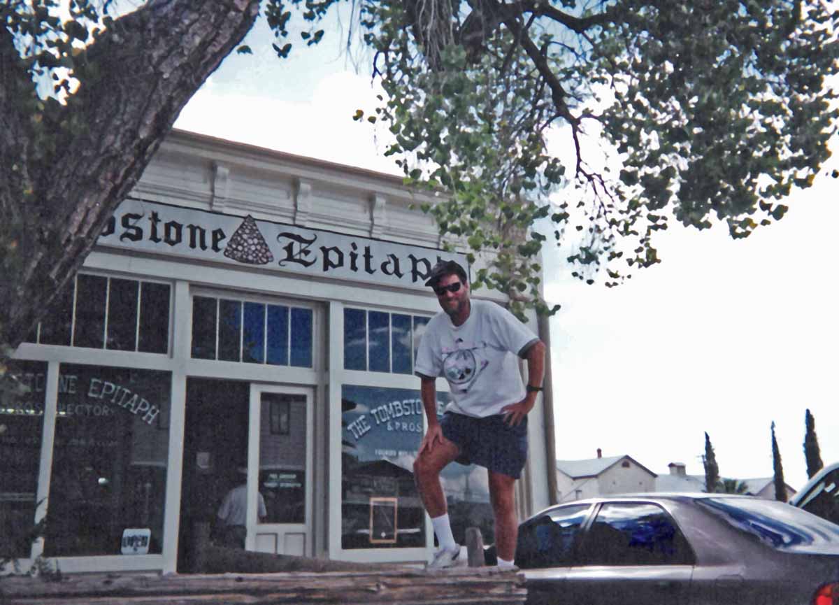 | Tombstone Hype Dyer's VW in Bisbee In Tombstone On the 19th, Toured Bisbee, and Tombstone with Dyer. Stopped by San Pedro River to see this 8' diameter trunk of this really big cottonwood tree. Had dinner at Pinnacle Peak in Tucson. Got way sick (same as Dyer's 2 days earlier).