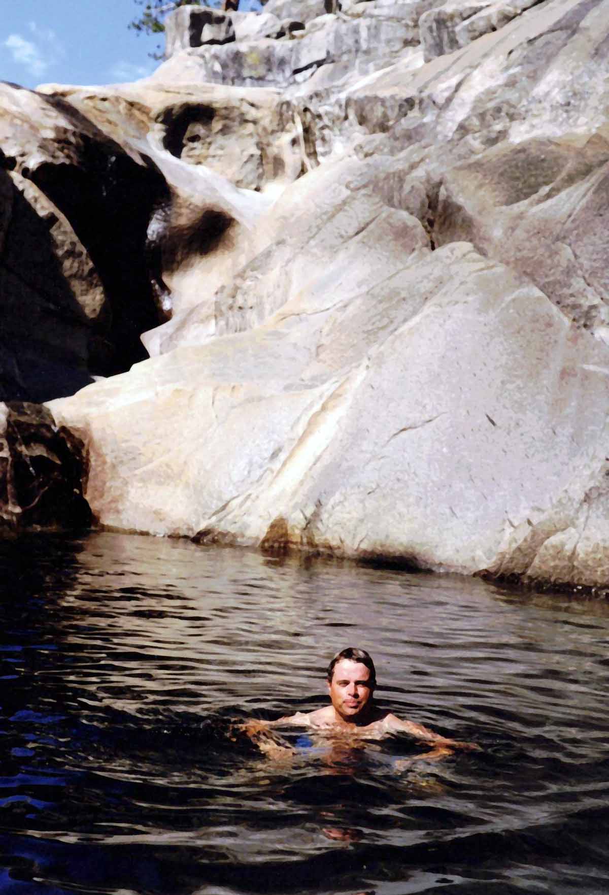 ![]() Yosemite Falls is behind Dyer ![]() Jef swam in this pool to far side and back - water temp just above freezing ![]() Dyer dutifully followed this foolhardy event ![]() ![]() Dyer in the water |