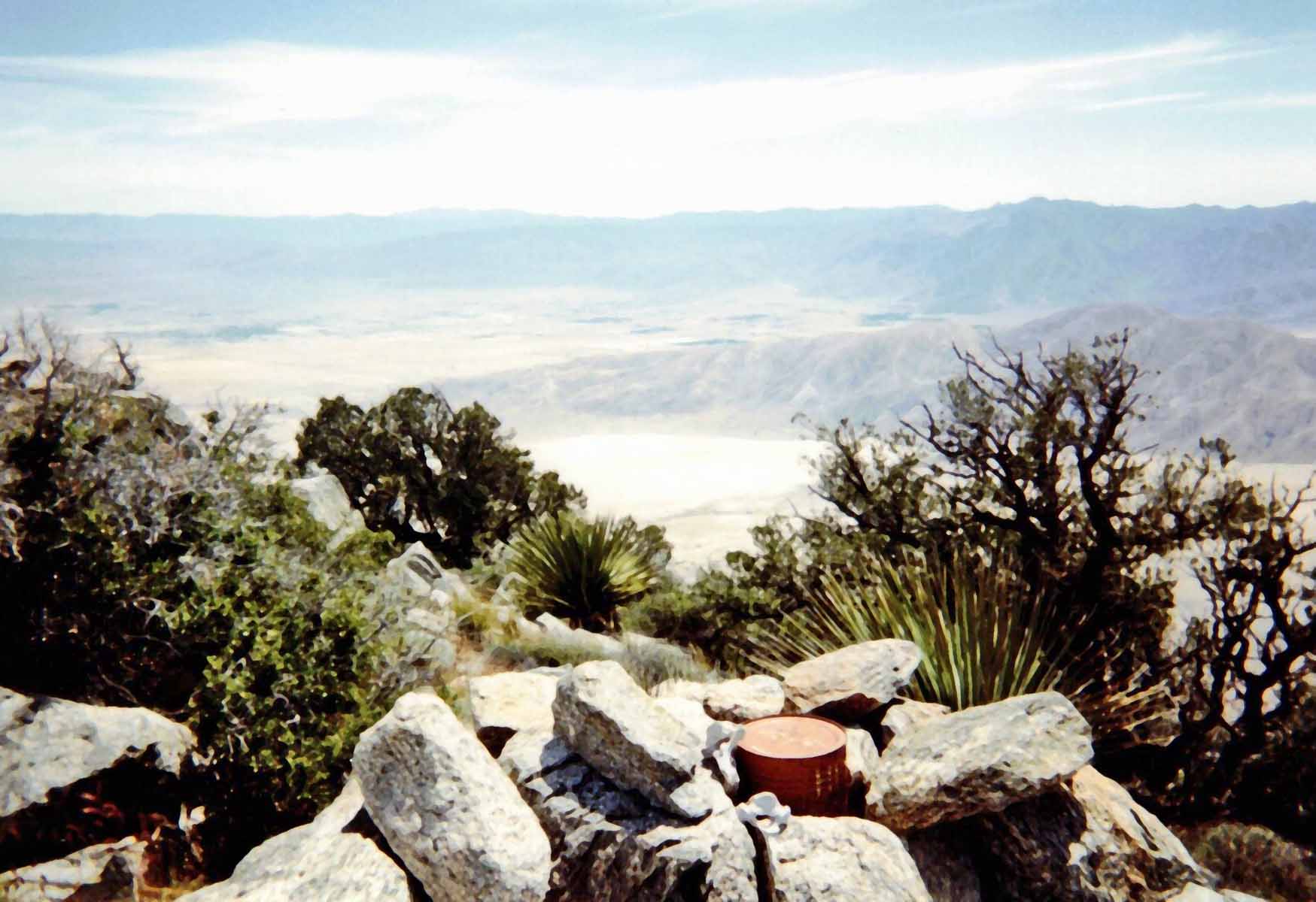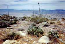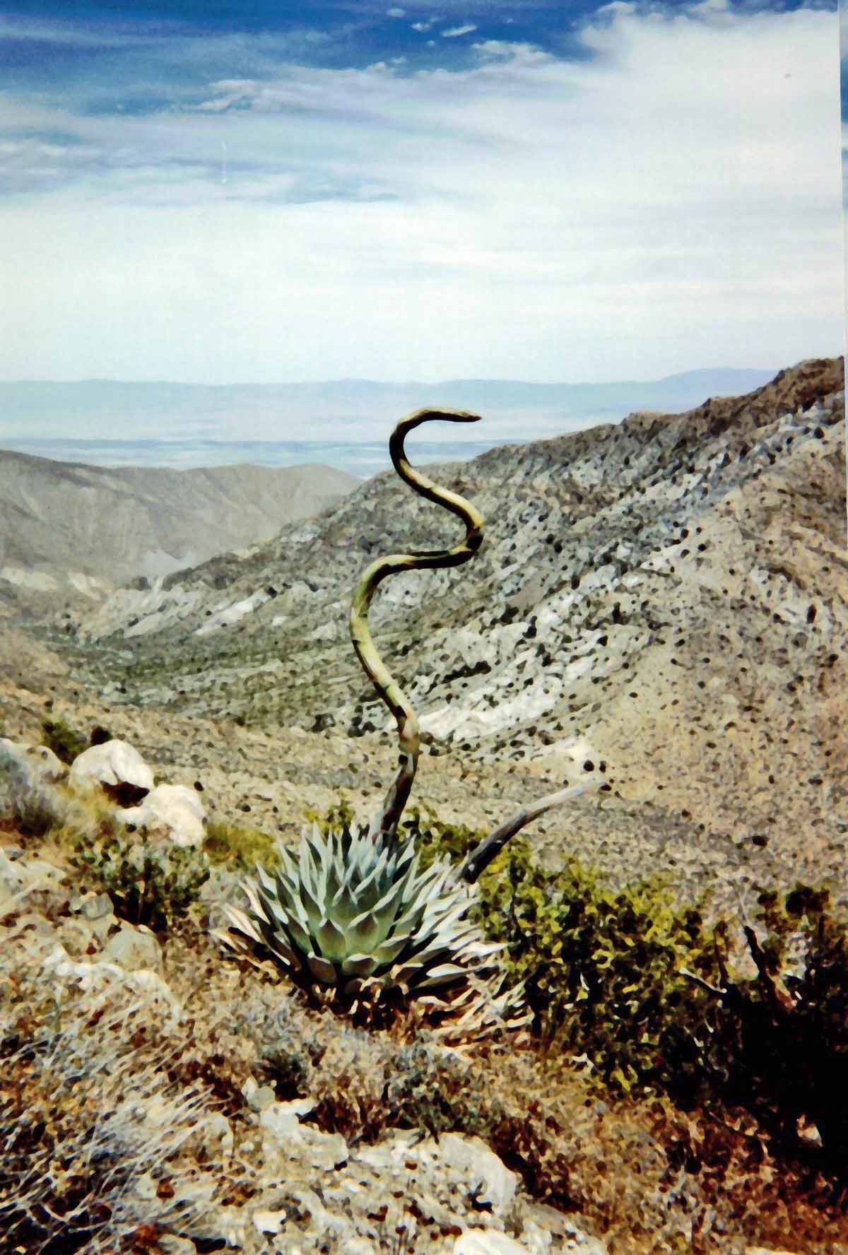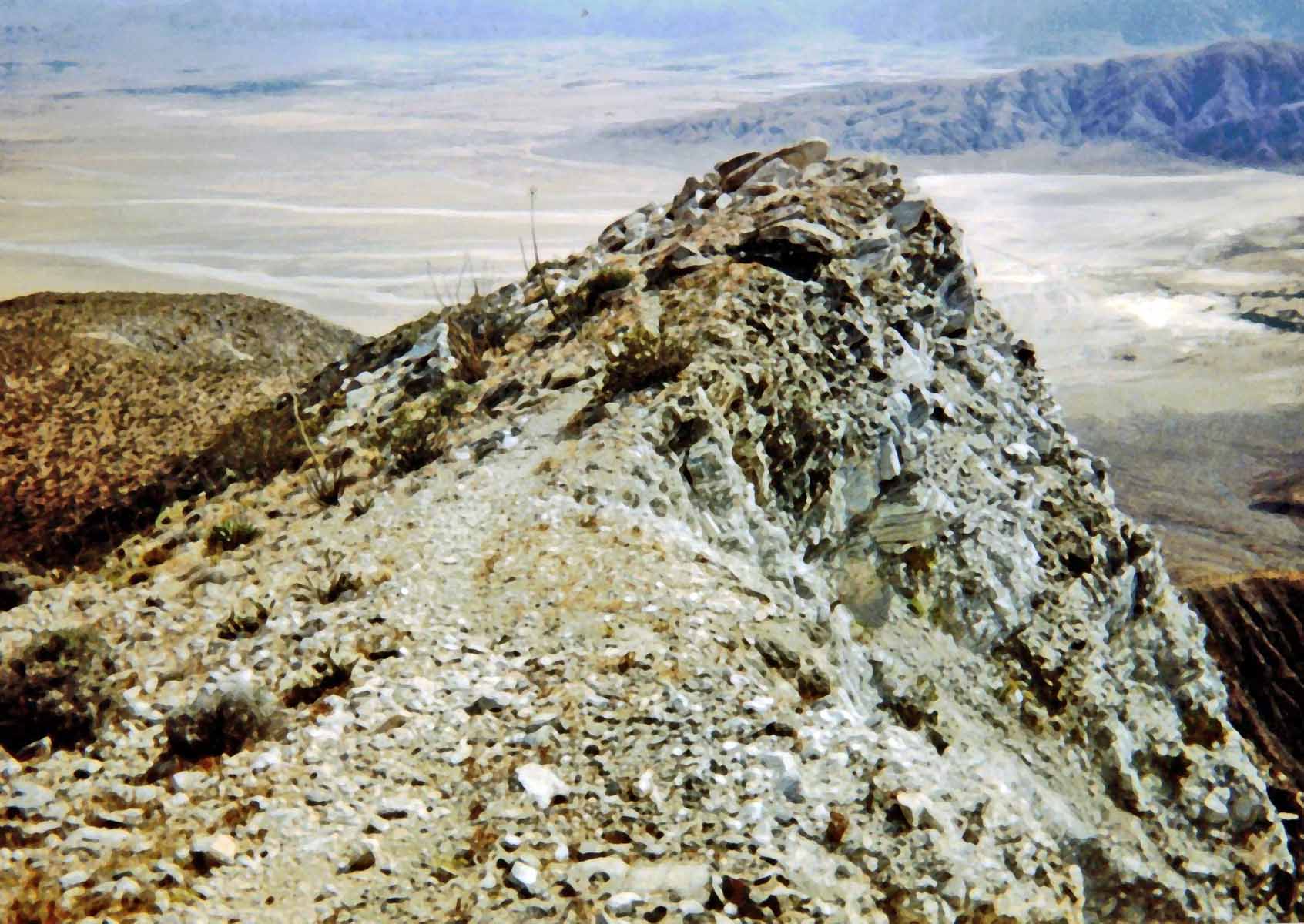The knife edge part of the hike Weird agave stem looking down on pass to Mile High Peak High enuff to finally see the Salton Sea to the east Thistle blooms The register at Villager Peak My backpack at the peak. No more pix on the way down, as I was going to be in severe distress the last half of the descent | |||||