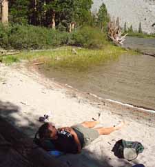 ![]() ![]() Jef on beach ![]() Fern Lake ![]() Trail crossing meadow ![]() Looking down towards June Lake ![]() June and Gull Lakes |