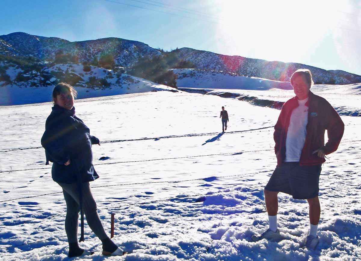 ![]() At the "Princess of Snails" ![]() ![]() View from hotel room ![]() ![]() In the hotel room ![]() Plane landing at Lindberg On the 26th, Kathy attended an all-day seminar on home care. Jef and Holley took it easy until checking out at 1pm. They then did a little shopping. After picking up Kathy, drove to Poway and linked up with Stacey at her apartment. We had dinner at a local sushi restaurant and went for a 1 hour walk that night. On the 27th, Holley went to Stacey's church - both noticed a little snow on side of road from previous night! After a not-so-good lunch at Coco's, we packed up and headed home. About 4 miles short of Santa Ysabel, hit bumper-to-bumper traffic. Turns out it was caused by "snow tourons". Snow was seen within 4 miles of Ramona along side the road. Traffic improved after passing Santa Ysabel, and within 2 miles of that town, it completely opened up. We stopped and checked out the snow on S-2 before getting home. ![]() Descending to Santa Ysabel ![]() ![]() Creek near Santa Ysabel ![]() Cattle ![]() Kathy tossing snowball at Jef ![]() Holley running across snow covered field ![]() ![]() ![]() Kathy ![]() Kathy, Holley, Jef ![]() Kathy throwing snowball at Holley ![]() Don't you eat that yellow snow! ![]() Getting back in car ![]() Snow rapidly vanished as we descended to Borrego ![]() Meanwhile that day, dad and Elsa erected dad's version of the star atop the San Jacinto Monument ![]() ![]() On the 28th, Back to work at the office -- a long day with 2 new patients. | |||||||||||||||||||||