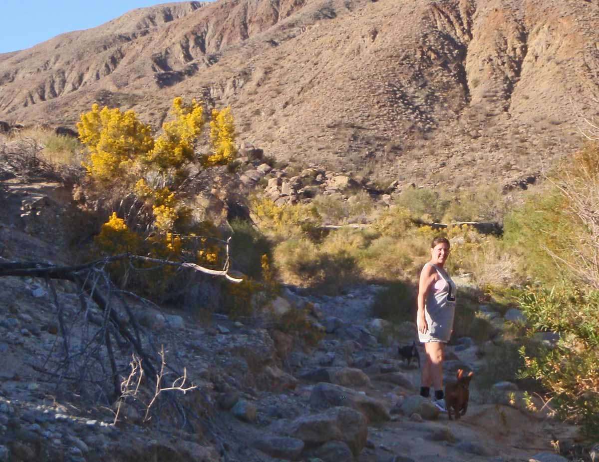 ![]() We sat in the sand in a shady spot ![]() Red flower nearby ![]() Palm grove and sycamores up-canyon ![]() Sheep Canyon panorama - doggies wandering in parking lot ![]() Rabbitbrush in bloom looking back towards Sheep Canyon ![]() Jeep crossing near Santa Catarina Spring (upper Lower Willows) ![]() ![]() Panorama showing Kathy celebrating reaching end of road at lower end of Middle Willows ![]() Water flowing thru Middle Willows ![]() We walked a little way up Middle Willows ![]() Mia notice sign said only pedestrian traffic allowed beyond this point at bottom of Middle Willows ![]() ![]() Much of the road getting up to Middle Willows was difficult ![]() ![]() Fall ocotillo colour while leaving Collins Valley ![]() ![]() Kathy driving while leaving Collins Valley ![]() Bypass road in good condition today ![]() ![]() Re-crossing 4th Crossing on way back home ![]() Panorama at 4th Crossing ![]() ![]() Kathy, Jef & Gypsi near 4th Crossing ![]() Verbena & creosote blooming ![]() Ocotillo blooming ![]() Got Tiki & Mia to leave after they found this coyote carcass ![]() Gypsi, Mia, Kathy & Jef near 4th Crossing On the 11th, took it easy all day at home. On the 12th, Kathy was ill, so took the day off. Jef worked most of the day at the office. ![]() A really unusual day - overcast! Highs in mid 80s. On the 13th, after a couple cancellations, a light day at the office. Kathy saw 3 home care in the afternoon, but turned into a long day for her. On the 14th, a long day at the office. On the 15th, after a short day at the office, drove Kathy, Tiki & Mia to Santee. Then went to dress fitting. ![]() Cougar track in front of Ellen's house ![]() Alyssa's dress On the 16th, took it easy in Santee. Jef did some shopping and did yardwork in front yard while Kathy broke her back cleaning up inside. Took doggie's on 2 mile walk this evening. ![]() Fixed up front yard on Big Rock On the 17th, took it easy, had a fire this morning. Kathy got some to-go food at Sab-E-Lee's on way back to Borrego. ![]() On the easy 2 mile hike up Mesa Road On the 18th, back to work for a medium day at the office. On the 19th, an easy day at the office. ![]() Sunrise this morning On the 20th, a long day at the office. ![]() Lenticular clouds hovered over Toro Peak most of this day ![]() ![]() On the 21st, just one patient at the office before going to SD for MD appointment. ![]() Cloudy skies this day ![]() Low sun came out after rain - from lobby of Casa Machado ![]() Panorama of parking lot - airport terminal/Casa Machado at left ![]() Rainbow On the 22nd, back to work at the office for a full day. Then went to Sundowner at Tumbleweeds, had some posole. Then went to Jr.High skool to pick up 4 previously paid for carne asada dinners, but had to wait in line for nearly an hour. |