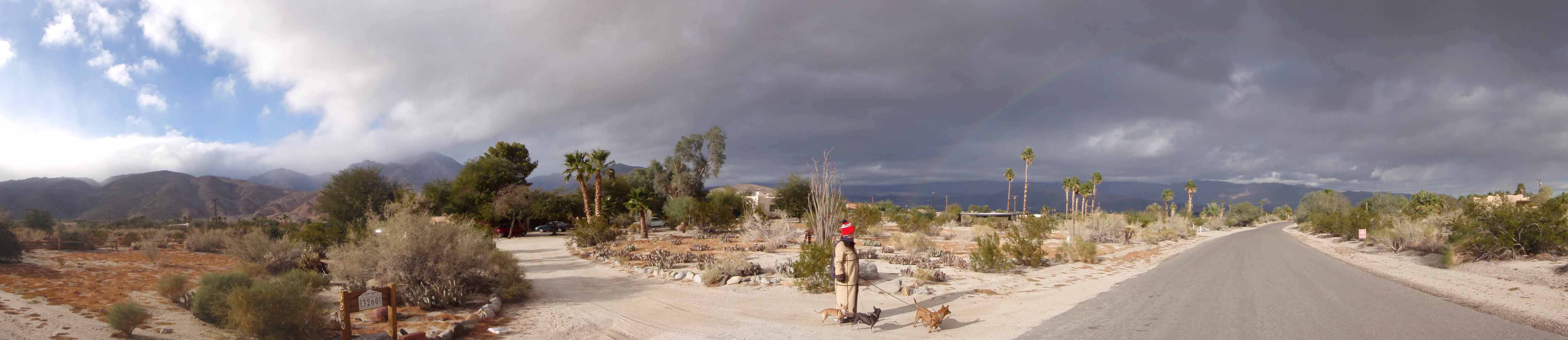 ![]() Praying mantis observed on the roof this day On the 2nd, back to work at the office for another long day. On the 3rd, Kathy saw 1 patient at the office, but wasn't feeling well, so took rest of day off. On the 4th, a relatively easy day at the office, and Kathy, still not feeling well, didn't try to do any home care. ![]() I set up last year's xmas tree in office in 5 minutes today ![]() Sunset this evening showing Mall's xmas lights over sheriff station On the 5th, took it easy all day at home, skipping work. ![]() Partial roof projects this day(including tapping in to swamp cooler wiring to run xmas lights -- swamp cooler was leftmost skylight) On the 6th, a long day at the office. On the 7th, took it easy on this storm-threatening day. Just a few drizzles. Took doggies on a 3 mile walk in the afternoon. ![]() In this panorama, Kathy has all 3 doggies. Rainbow is moderately faint in center. ![]() Clearly evident rainbow as we hit Tilting T On the 8th, mostly took it easy, but in the afternoon, went shopping for Kym's b'day. Jef cooked up a batch of stew & Kathy baked a cake. ![]() Kathy baked this cake for Kym's b'day On the 9th, back to work for a long day at the office. On the 10th, a relatively easy day at the office. ![]() Someone's fireplace smoke was almost horizontal in this sunset pic On the 11th, a very busy day at the office. ![]() Sunrise this morning On the 12th, a rain front moved into the valley from the east. Another very busy day at the office. ![]() Panorama taken after taking out trash showing storm front to the east ![]() Panorama showing rain sheets - less than 10 miles out ![]() Giant pile of yard waste slowly being reduced by putting in trash On the 13th, had a medium busy day at the office, after which had El Borrego takeout for dinner. On the 14th, after taking it easy most of the day, did a lot of shopping & then cooking - made about 3-4 gallons of soup and had tostadas for dinner. On the 15th, mostly took it easy, but did go on a 1 hour walk in the late afternoon. ![]() Cool sunrise in Borrego this morning ![]() On the 16th, had a long day at the office, made harder with Alicia on vacation for a month in Mexico. Over the past week, temperatures had been rising into the 70s and this was the first of several days with highs in the upper 70s. On the 17th, a medium day at the office. Then packed up and drove to Santee. In transit, Stacey mentioned she & Erik were heading to Garrison Street, so we headed straight there. Despite Kathy's living in OB for so many years, we managed to get lost, but eventually found it. ![]() Erik, Kathy, Stacey with Xmas decorations at Garrison Street ![]() All of us ![]() Panorama of one of the show-yards |